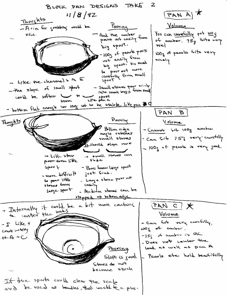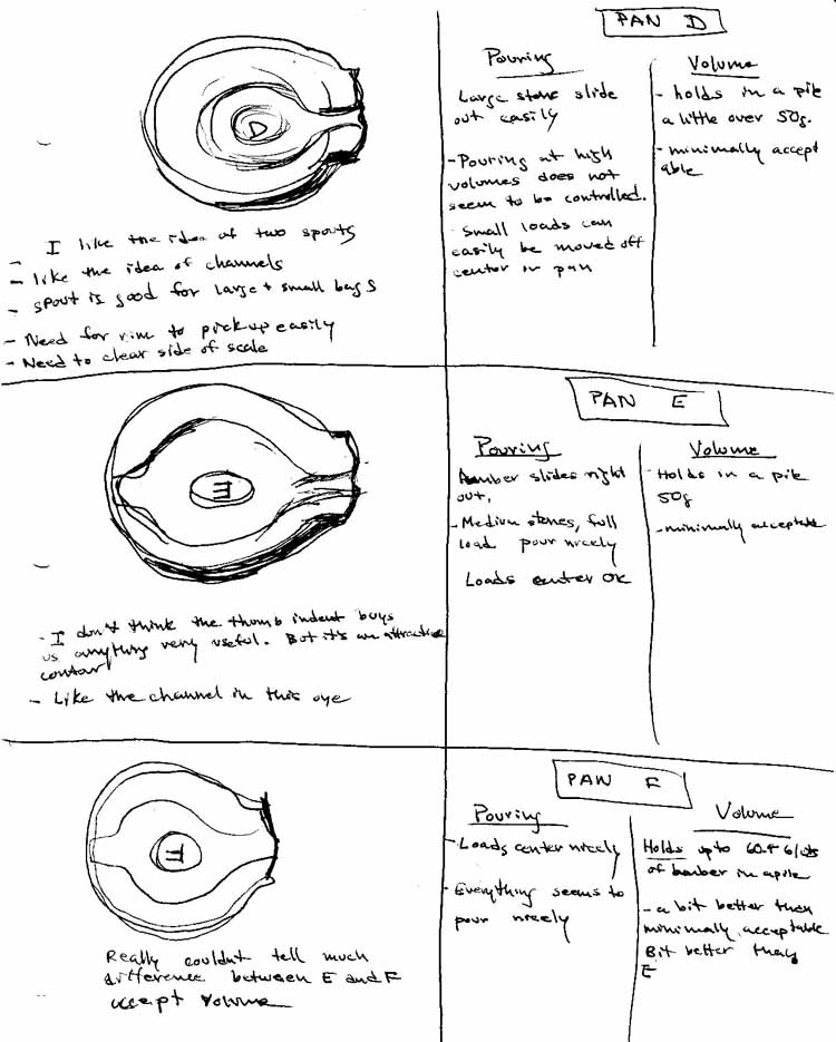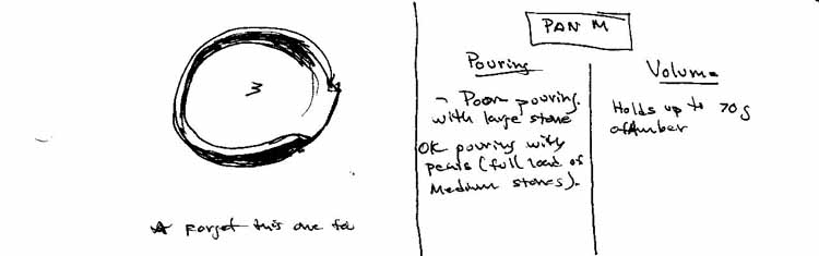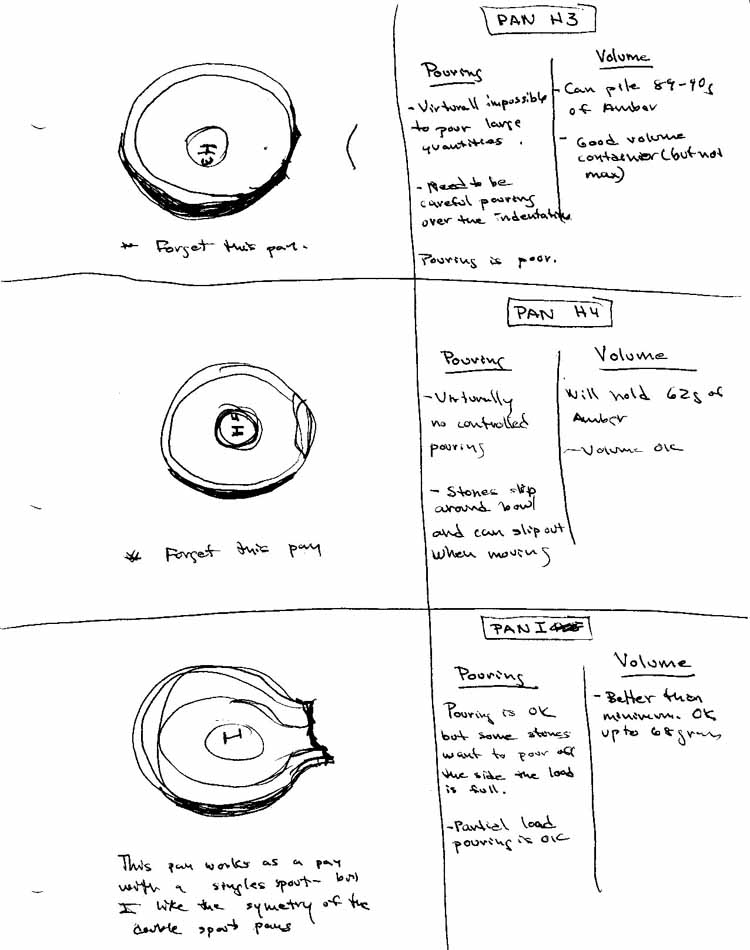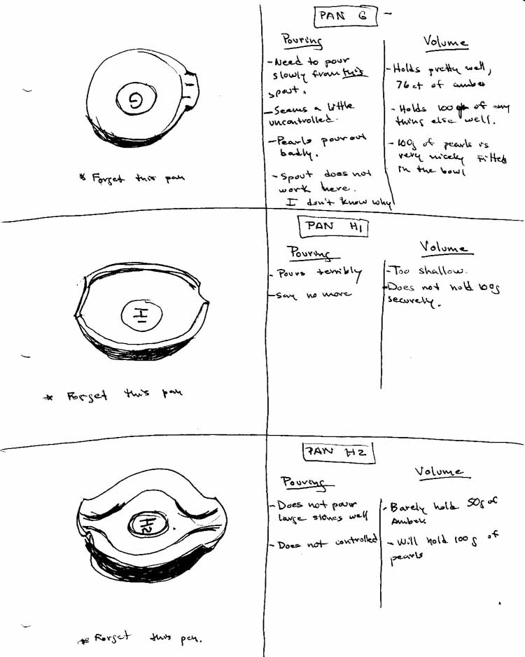 PAN A/ is a promising pan.  It holds 100g of amber piled up carefully.  It will hold every other material nicely and easily.  It needs a weight locating area.  The angle of the slope of the bowl is a bit steep as an excessive angle is required to get the last stones out at the end of a pour.  Internal contouring as done in pan E and Pan F would help.  Also I would like to see the slope of the smaller spout eased from  this to something like this.  An edge around the rim would make it much easier to pick up from the scale.