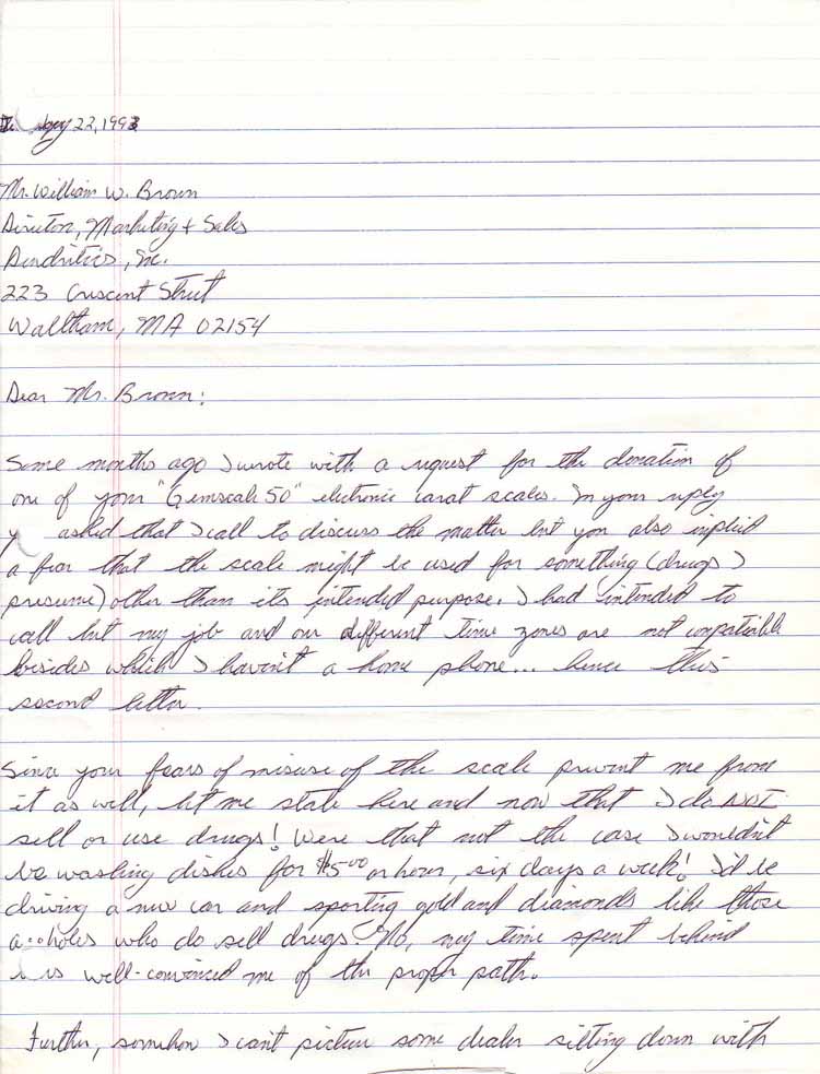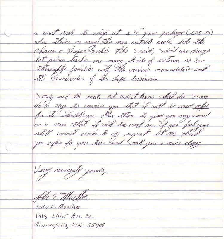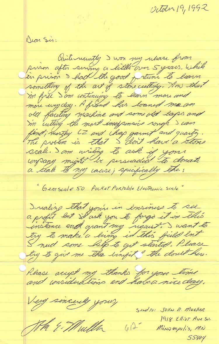 This was one of the more amazing series of letters. In October 1992, this chap won his release from prison and wanted to make himself a new life. Although he was making $5 an hour washing dishes, he wanted a Gemscale. You may or may not believe his tale, but we did. And you may not believe it, but we sent him a Gemscale 50 for free. We wish the best to John Mueller.